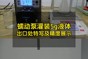 蠕動(dòng)泵灌裝5g液體出口處特寫及精度展示